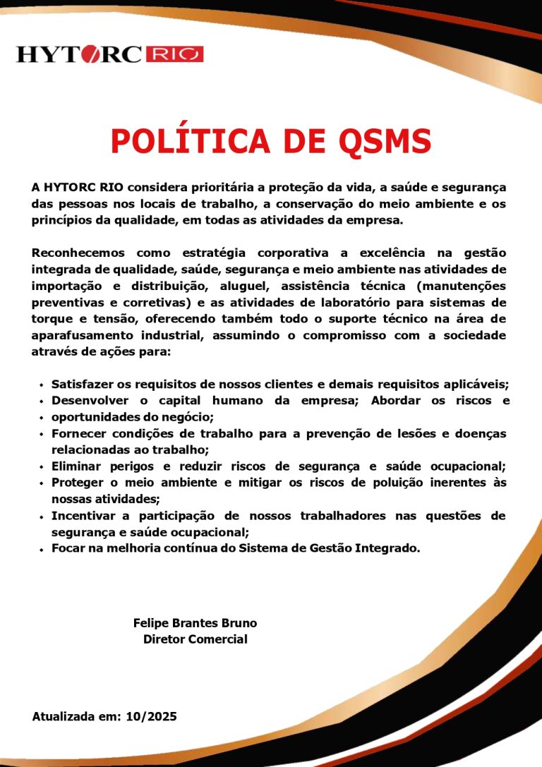 Investimos em processos organizacionais e em constantes certificações para garantir os mais elevados padrões de qualidade em todas as áreas de negócio, desde o desenvolvimento de produtos até o atendimento ao cliente. Além disso, todos os equipamentos HYTORC passam por inúmeras horas de inspeção em nosso próprio laboratório – acreditado pelo Inmetro – que estão prontos para oferecer total rastreabilidade no histórico de manutenção de nossas aplicações. Conte com uma equipe composta por profissionais extremamente capacitados, que incorpora esses padrões em todos os aspectos do trabalho, sinônimo de compromisso e confiança nas relações.
